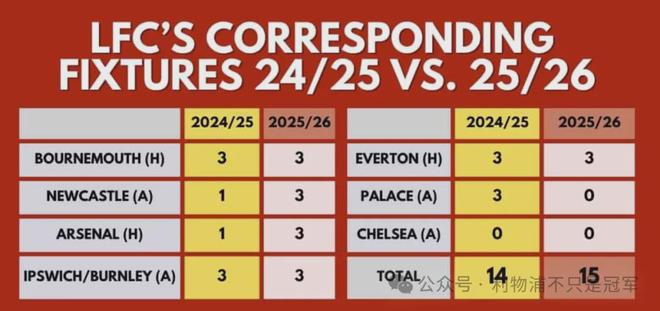首先,看看利物浦已经踢过的赛程。在开局的七场英超比赛中,斯洛特的球队已经面对了五支目前排名前八的球队。与上赛季同样对阵的比赛结果相比,他们实际上还多拿了一分。